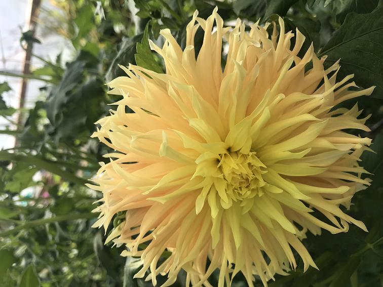 Dahlia 'NP Frizzy Lizzy' Our own variety ! Opens up as yellow then adds peach tones to this cactus style dahlia. Very prolific , nice stems. Average 5in blooms. Will grow to 5-6' tall