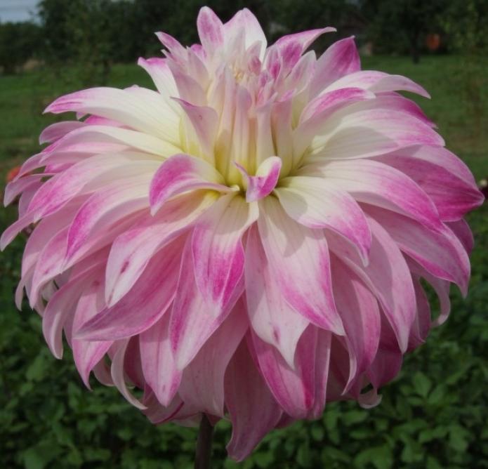 Dahlia 'Pink Petticoat' boasts 6 inch flowers, are white at the centre, blend to pink towards the petal ends and are often decorated by dark pink speckles! Blooms throughout summer and fall until frost. SOLD per Tuber. |
