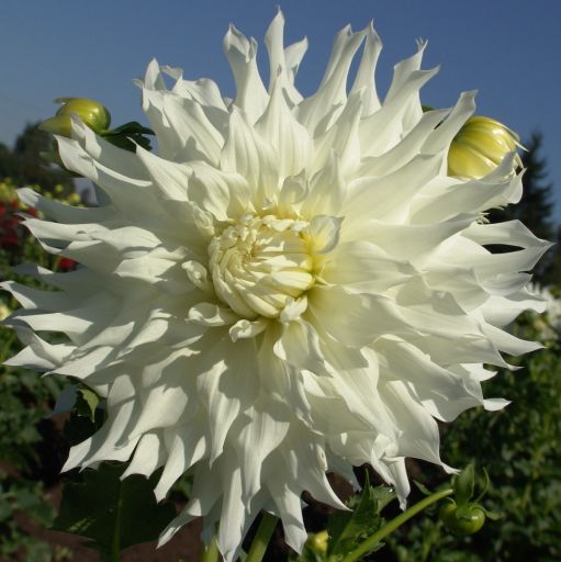 Dahlia 'Walter Hardisty' is a giant informal decorative dahlia that boasts 12-inch showy snow-white blooms with a soft-yellow centre. Quite prolific for a large dinnerplate dahlia.